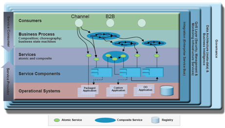 ■ 消費(fèi)者層:消費(fèi)者層是消費(fèi)者的入口,不管是人、程序、瀏覽器或者自動(dòng)操作,以及與 SOA 相互作用都可從此切入。這使得一個(gè) SOA 解決方案可以支持一個(gè)客戶端獨(dú)立的、通道不可知的功能集,通過一個(gè)或多個(gè)通道(客戶端平臺或設(shè)備)獨(dú)立消費(fèi)以及開出賬單。所以說它是所有內(nèi)外部交互式消費(fèi)者(人類或者其他應(yīng)用程序/系統(tǒng))和服務(wù)(例如,B2B 場景)之間的切入點(diǎn)。該層提供快速創(chuàng)建前端業(yè)務(wù)流程和綜合應(yīng)用程序的功能,以響應(yīng)市場變化。它使得通道能夠獨(dú)立訪問那些應(yīng)用程序和平臺所支持的各種業(yè)務(wù)流程。消費(fèi)者和其余底層 SOA 的解耦為組織提供支持敏捷性、增強(qiáng)重用以及提高質(zhì)量和一致性的能力。